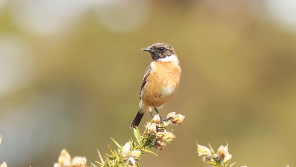 The stonechat is often heard before it is seen – imagine two pebbles being tapped together that’s what it sounds like.