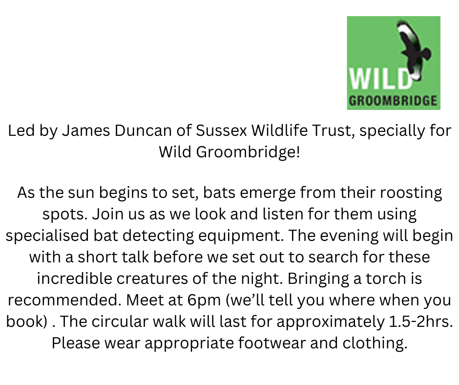 We’re so lucky! James Duncan from Sussex Wildlife Trust has offered Wild Groombridge a guided bat walk. It’s at 6pm on Tuesday 1 October, it’s free, and you’re all welcome (no need to be a member of Sussex Wildlife Trust or Wild Groombridge).