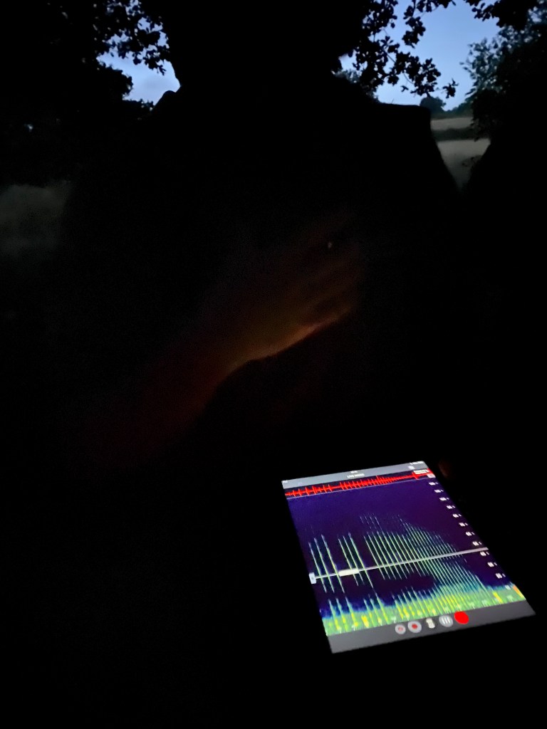 And there they were above our heads, Common and Soprano Pipistrelles, both tiny, hunting in the lime trees by the river. Our devices picked up their echo-locating, and the zzziiiippp as they homed in on their prey and caught it. James’s iPad showed us the sound in visual form, each kind of bat making a distinctive shape.